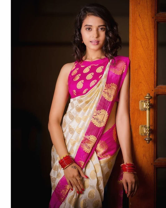 WHITE Banarasi zari woven SOFT LICHI SILK SAREE