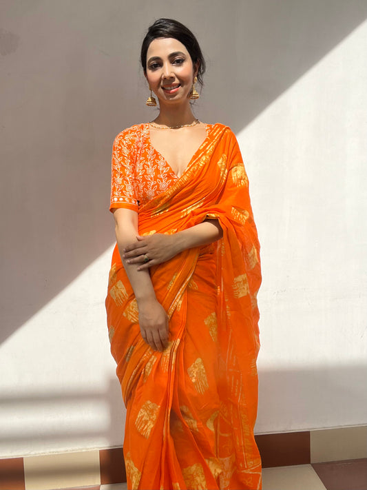Handicraft Women's Ikat Hand Print Pure soft Cotton Saree With Blouse Piece