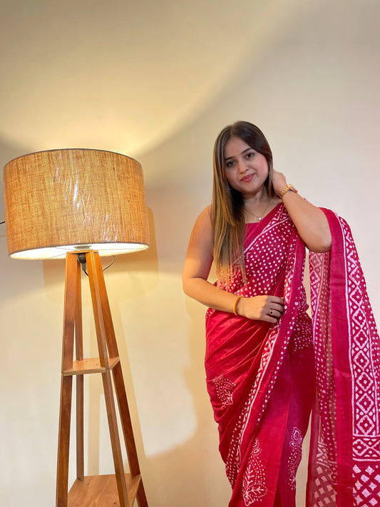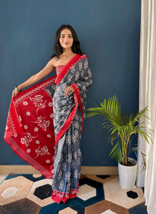 Handicraft Ladies Block Print Pure soft Cotton Sari With Blouse Piece Barkha Red