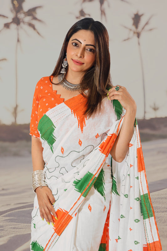 Handicraft Ladies Ikat Print Pure soft Cotton Sari With Blouse Piece