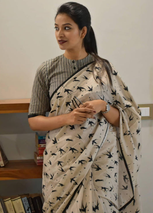 Handicraft Ladies Ikat Block Print Pure soft Cotton Sari With Blouse Piece panchi