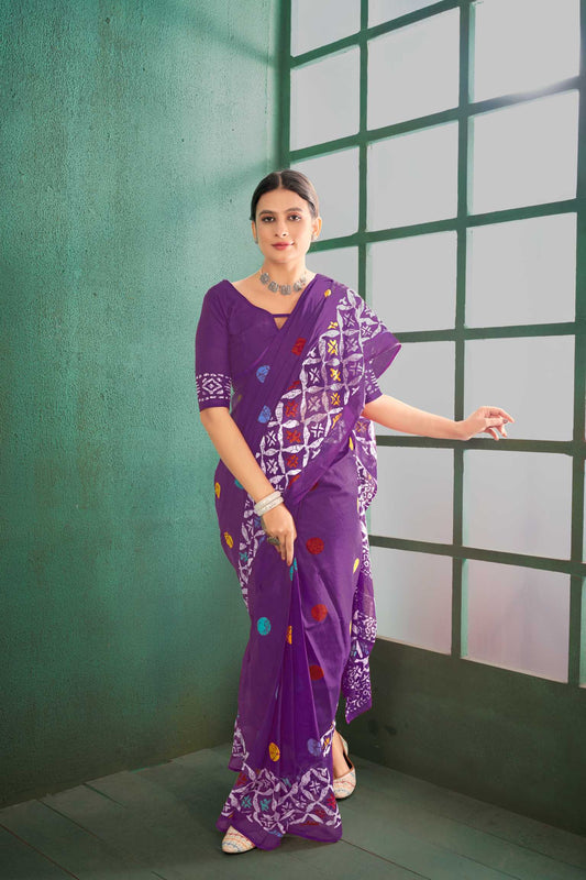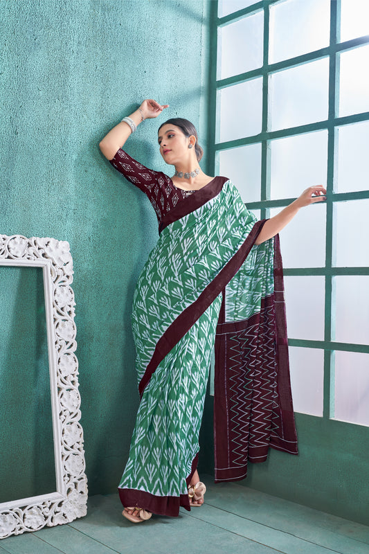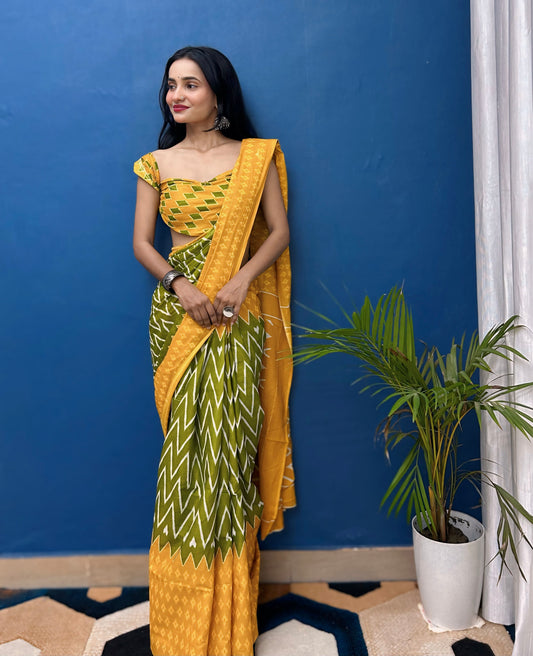 Handicraft Ladies Ikat Block Print Pure soft Cotton Sari With Blouse Piece
