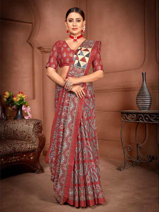 Handicraft Ladies Ikat Block Print Pure soft Cotton Sari With Blouse Piece AJRAKH