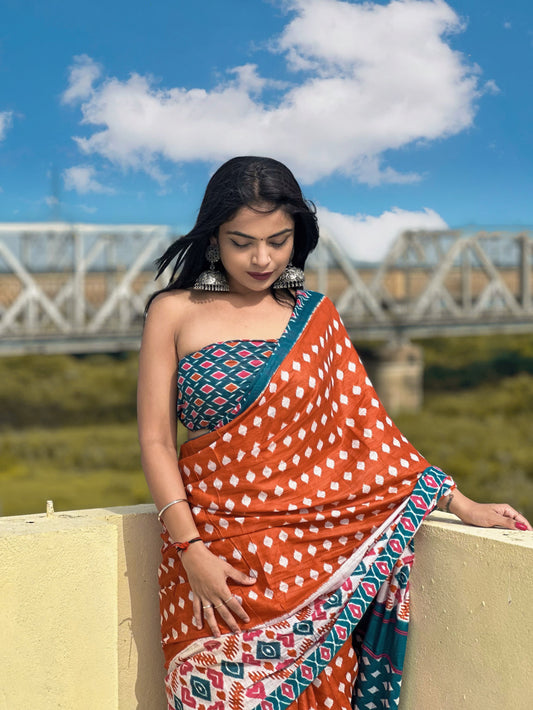 Handicraft Ladies Ikat Block Print Pure soft Cotton Sari With Blouse Piece AJARAKH