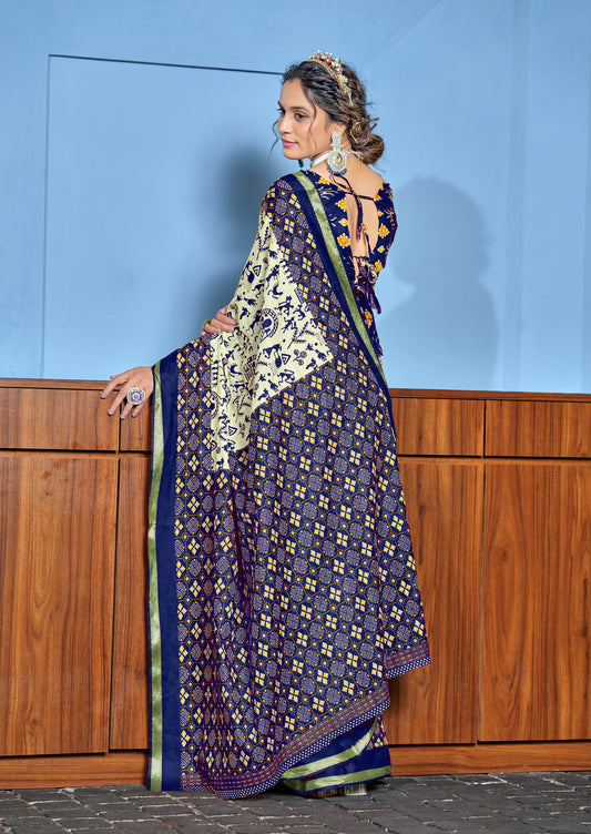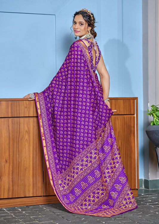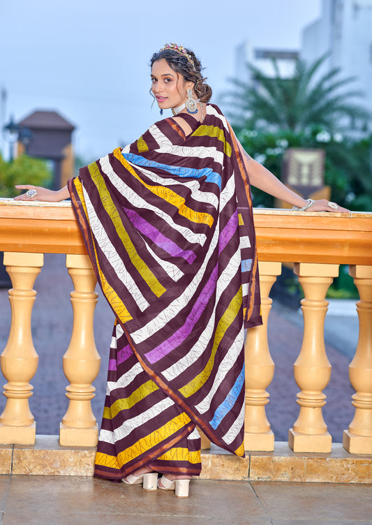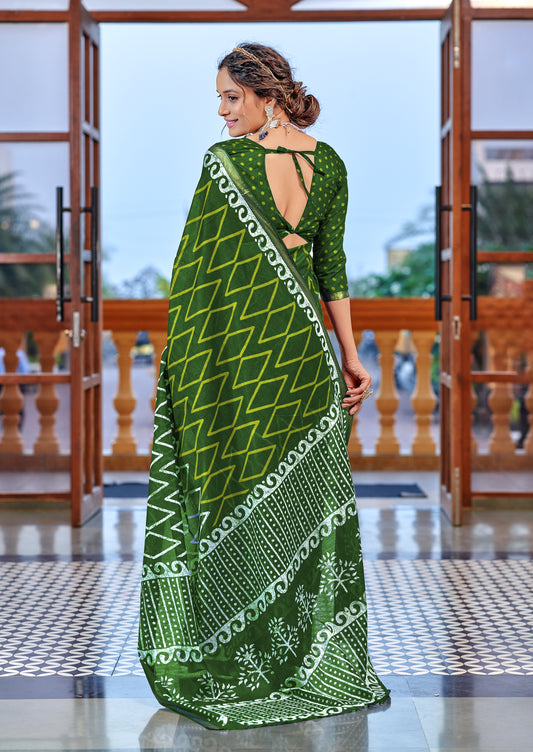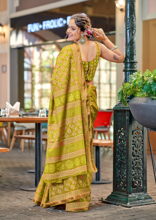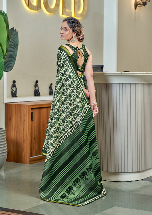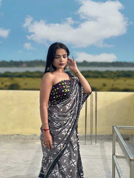 Beautifu Zari Border Bagru Ikat Hand Print Cotton mulmul sarees with blouse Piece