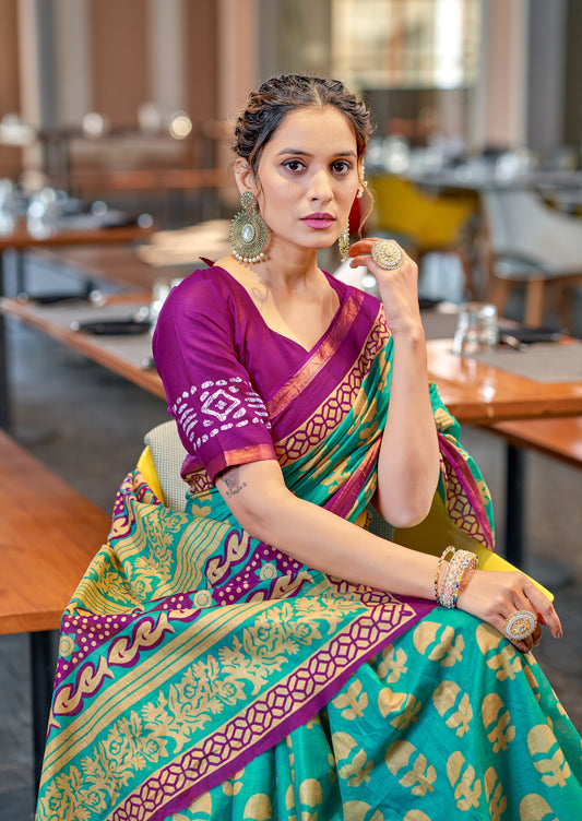 Handicraft Ladies Ikat Pure soft Cotton Sari With Blouse Piece Barkha Firozi