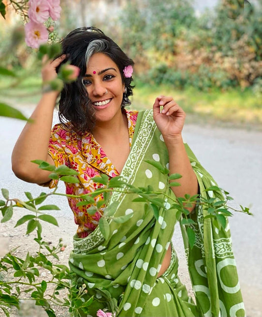 Handicraft Ladies Ikat Block Print Pure soft Cotton Sari With Blouse Piece