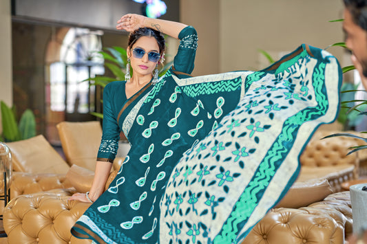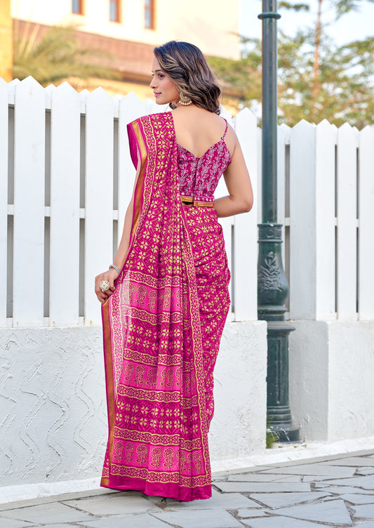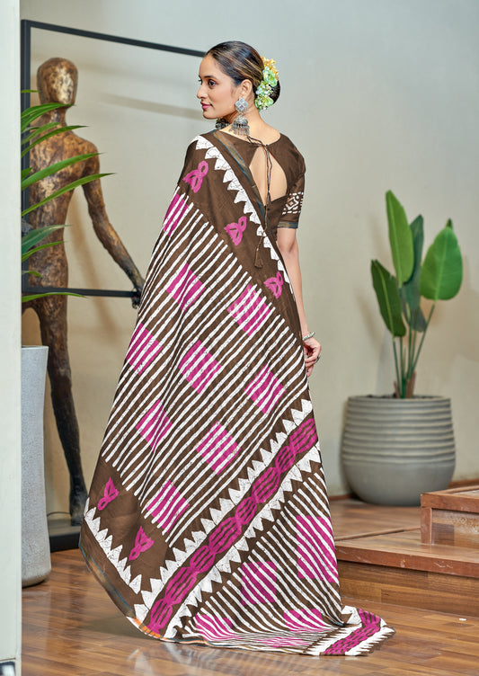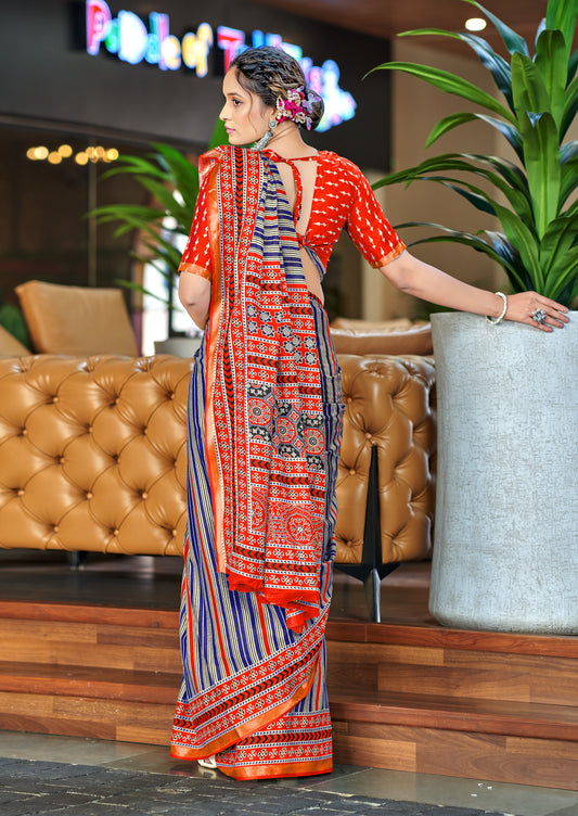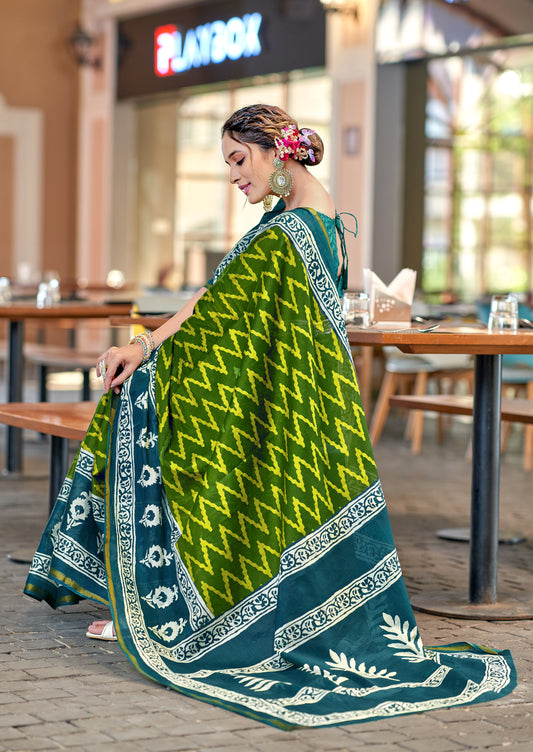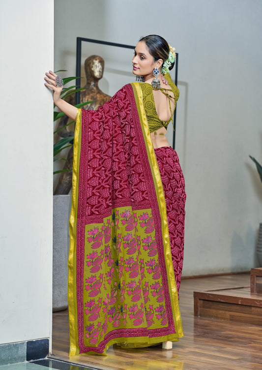Beautifu Zari Border Bagru Ikat Hand Print Cotton mulmul sarees with blouse Piece