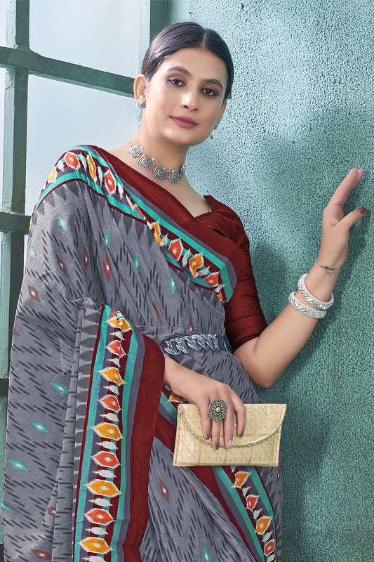 Handicraft Ladies Ikat Block Print Pure soft Cotton Sari With Blouse Piece