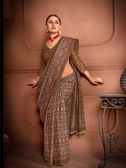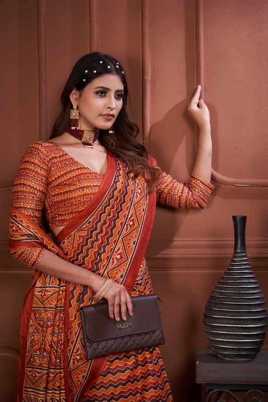 Handicraft Ladies Ikat Block Print Pure soft Cotton Sari With Blouse Piece AJARAKH